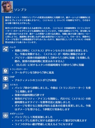 2024年10月中旬、オーバーウォッチはシーズン13が始まった。さまざまなバランス調整が入ったこのシーズンだが、特に大きな変更があったのがソンブラであり、リワークと言ってもいいレベルの変更となっている。 2024年10月のパッチノートより。急に変わりすぎ…
